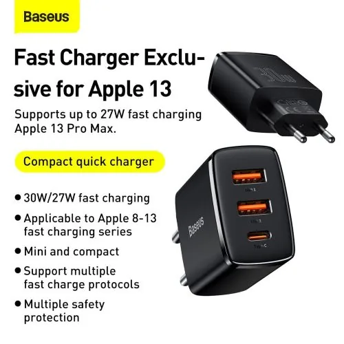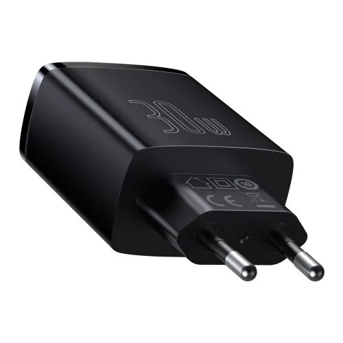 • Baseus Travel Charger Compact Quick Charger U+U+C PD3.0, QC 3.0 30W EU Fekete (CCXJ-E01), Kompakt 30W