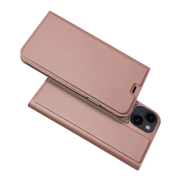 • iPhone 15 Pro tok, oldalra nyíló, műbőr, Rózsaarany